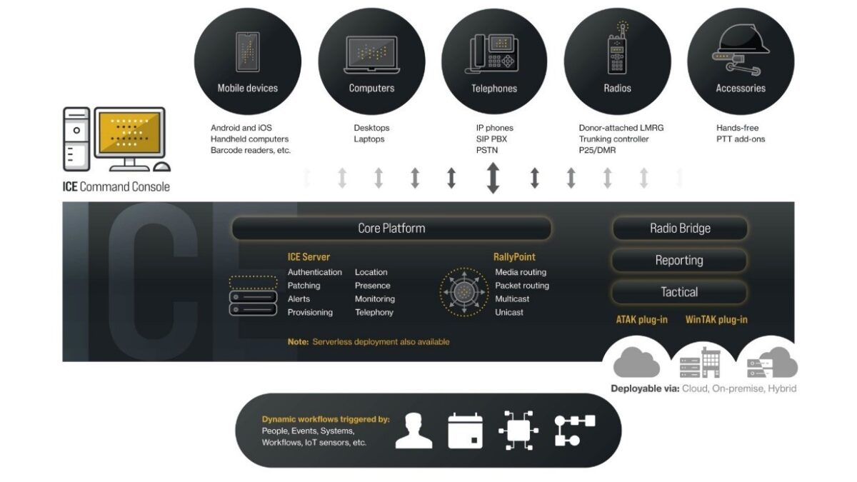 At the heart of the ICE solution are the Instant Connect Enterprise Server™ and RallyPoint media bridge, collaborating to provide the platform’s centralized management and cross-network interoperability. You can then add Mobile/Desktop clients and a host of other optional services to build out your custom environment.
